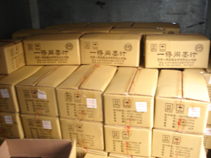 接到委托后,集佳立即組織調查維權部專案律師,前往案發(fā)地區(qū),再一次核實了侵權事實,并準備了完整的證據(jù)材料,向山東省臨沂市工商行政管理局投訴。該局分析案情后,決定與山東省臨沂市公安局,開展一場聯(lián)合執(zhí)法行動。次日,由多名工商局和公安局組成的聯(lián)合執(zhí)法大隊,在投訴人的帶領下,徑直前往侵權企業(yè),經過一番仔細搜查,發(fā)現(xiàn) “一得閣”墨汁115箱,標識近600個,包裝盒近400個,商品說明書100份,經過一得閣公司技術負責人現(xiàn)場鑒定,以上查扣物品均為假冒侵權貨品。鑒于此,工商執(zhí)法人員,立即對以上侵權貨品予以查扣。據(jù)代理律師透露,該案的涉案較高,工商行政管理部門在對侵權人依法做出行政處罰的同時,依職權可將案件移交公安機關以追究侵權人的刑事責任。目前,該案在進一步的審查處理過程中。(以下為現(xiàn)場拍攝下來的侵權產品)