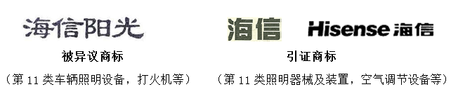 本案是一件典型的突破群組認定類似商品、適用《商標法》第三十條(相同/類似商品上相同/近似商標)而不適用第十三條(馳名商標)的案件。被異議商標指定商品是“車輛照明設備,噴燈,汽燈,熱儲存器,壁爐,自動澆水裝置,打火機,固體、液體、氣體燃料加熱器,便攜式一次性消毒小袋”,而本案引證的第11類三件“海信”商標核定的商品并未完全覆蓋被異議商標指定商品所在的群組,“噴燈,壁爐,固體、液體、氣體燃料加熱器,熱儲存器,自動澆水裝置,便攜式一次性消毒小袋,打火機”這些商品均處在未覆蓋的群組上。但商評委在做出裁定時,考慮了“海信”商標的知名度,直接認定這些商品與第11類三件“海信”商標構成類似商品,從而適用《商標法》第三十條予以保護,不再適用《商標法》第十三條。關于近似商標的認定方面:因“海信陽光”完整包含“海信”,“陽光”二字在第11類“車輛照明設備”等商品上顯著性較弱,考慮到“海信”商標的知名度,認定兩商標構成近似商標。