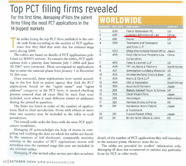 根據全球權威知識產權刊物Managing Intellectual Property (MIP)2009年10月期公布的一份數據顯示,全球PCT申請統計中,在申請日(優先權日)介于2006年7月1日至2007年6月30日之間,30個月的絕限落在2009年1月至2009年12月間的已經公開的PCT申請中,集佳知識產權代理有限公司以687件申請在全球代理機構排名中僅次于一家美國事務所而位列第二,也是中國唯一一家躋身全球前五名的知識產權服務機構。