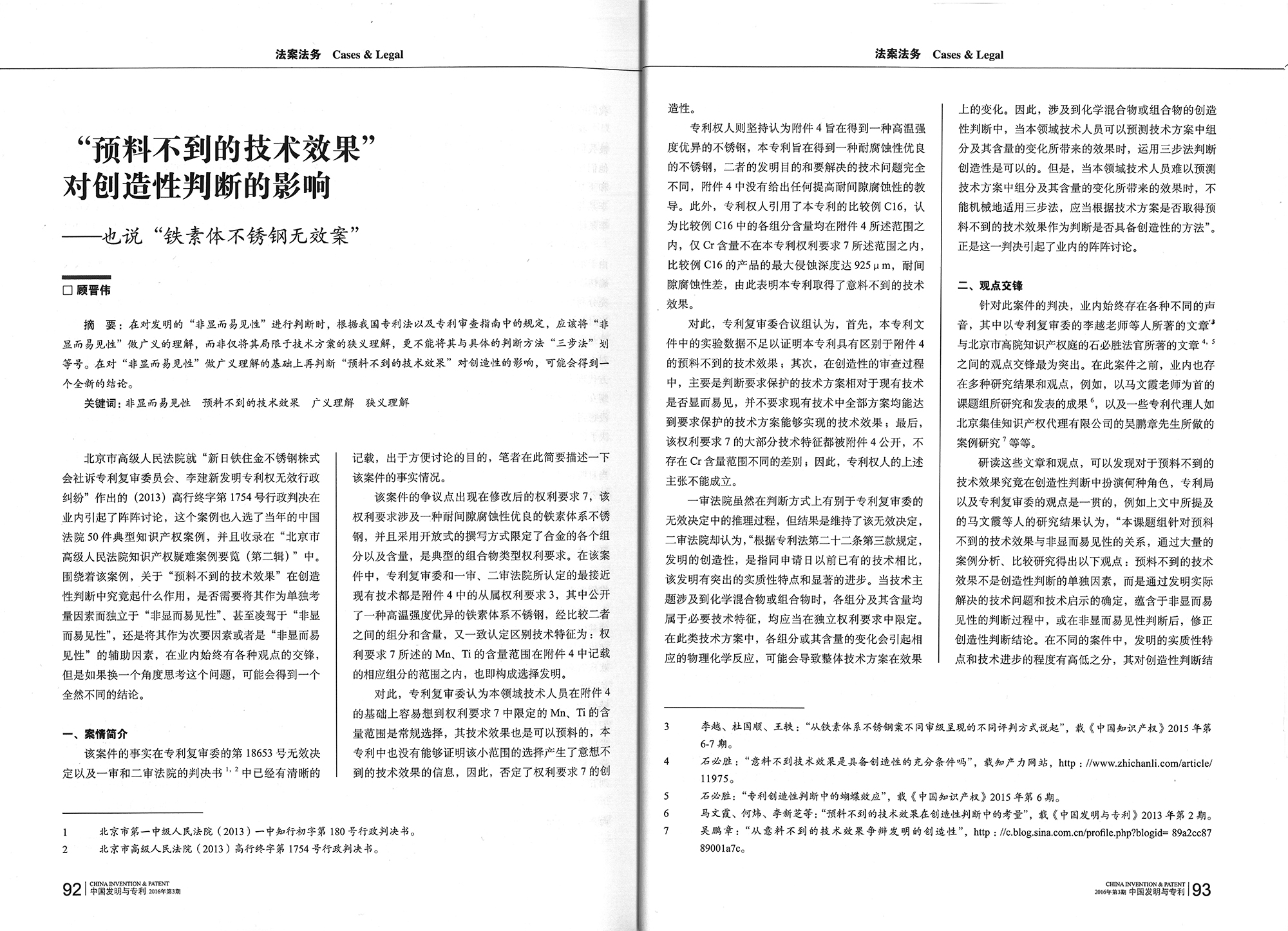 集佳代理人文章《“預(yù)料不到的技術(shù)效果”對(duì)創(chuàng)造性判斷的影響--也說(shuō)鐵素體不銹鋼無(wú)效案》在《中國(guó)發(fā)明與專利》發(fā)表