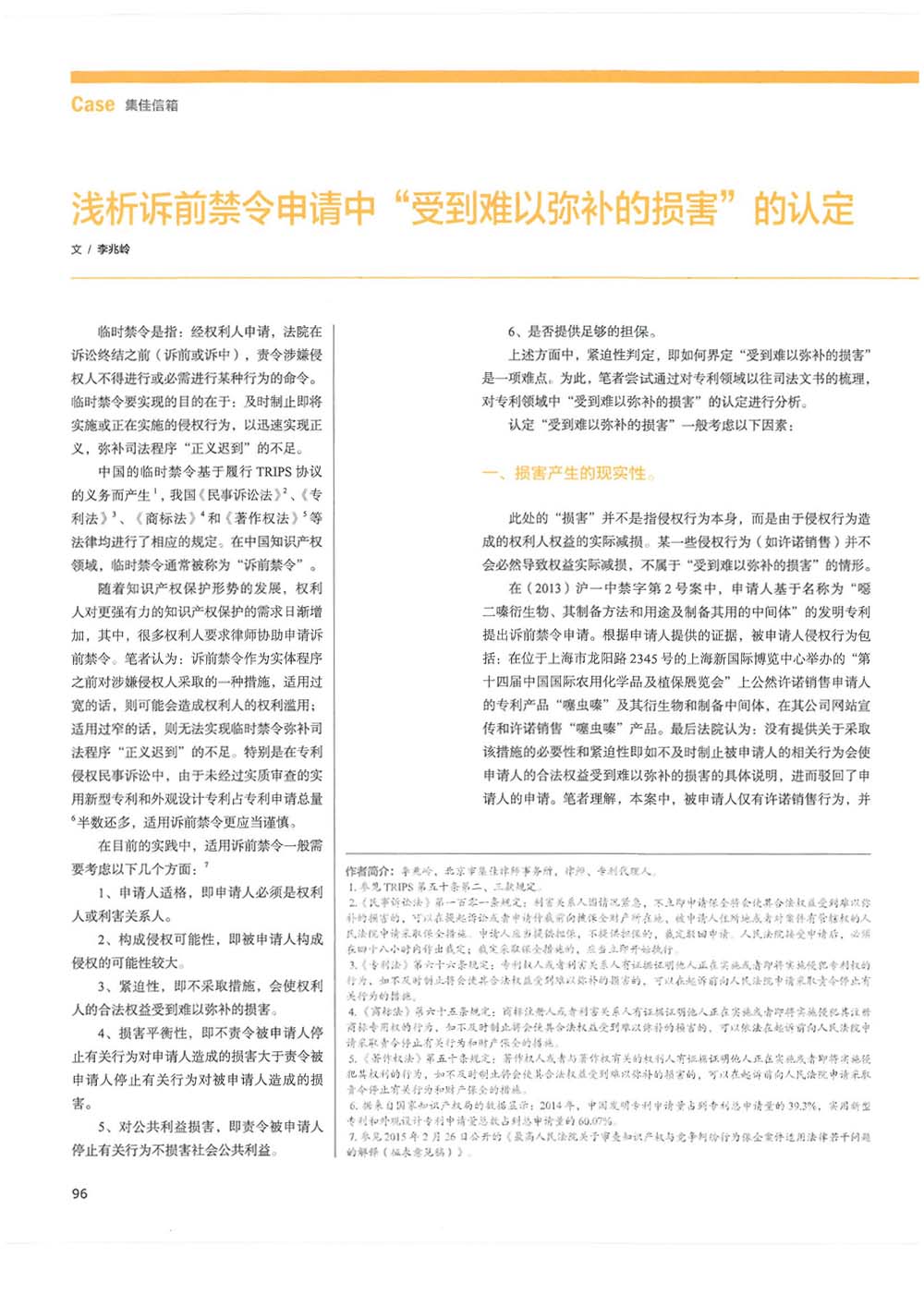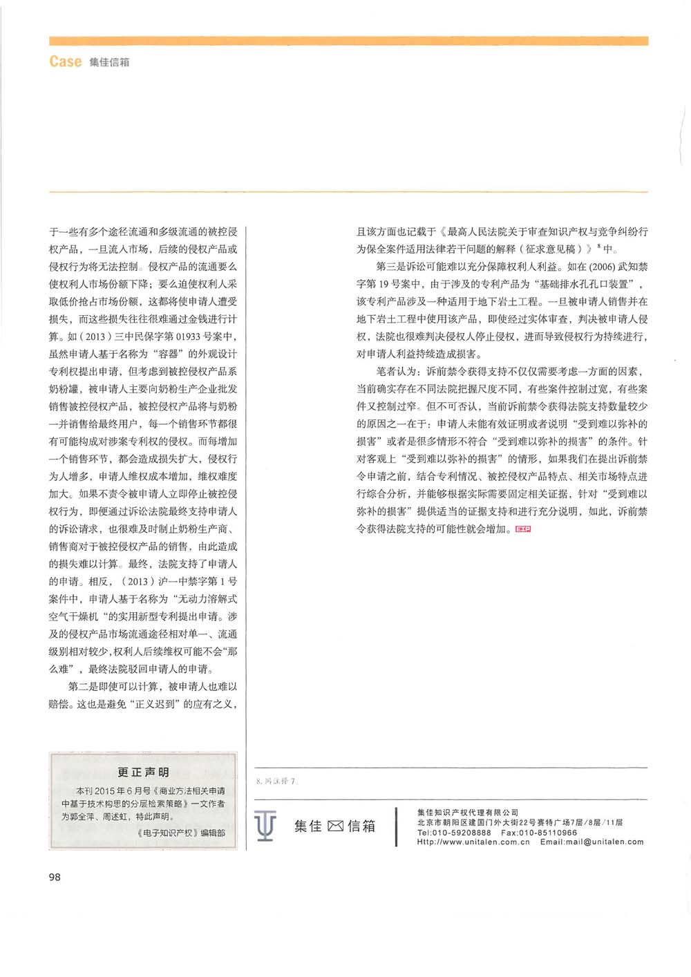 集佳律師文章《淺析訴前禁令申請中“受到難以彌補(bǔ)的損害”的認(rèn)定》在《電子知識(shí)產(chǎn)權(quán)》發(fā)表