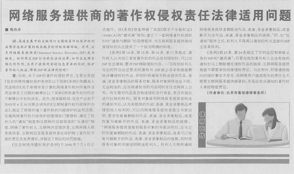 集佳律師文章《網絡服務提供商的著作權侵權責任法律適用問題》在《中國貿易報》發表