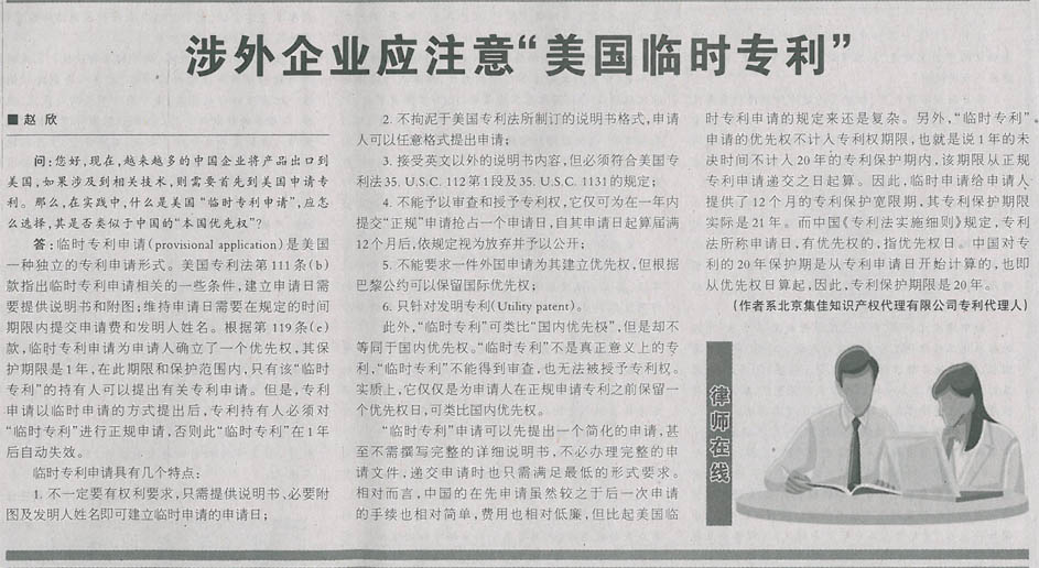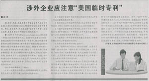 集佳代理人撰文《涉外企業(yè)應注意“美國臨時專利”》在《中國貿(mào)易報》發(fā)表