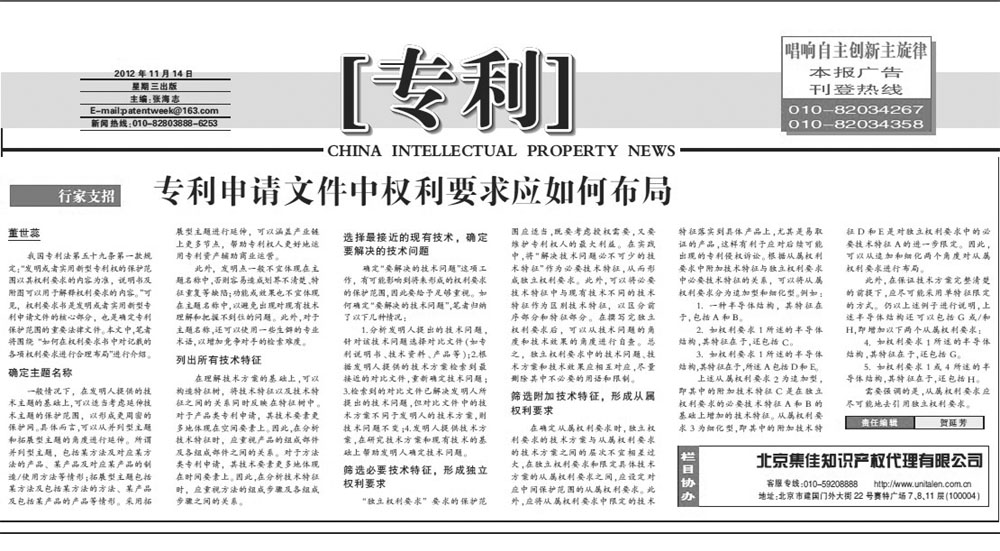 《中國知識產(chǎn)權(quán)報》:專利申請文件中權(quán)利要求應(yīng)如何布局
