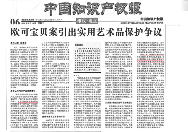 《中國知識產權報》:歐可寶貝案引出實用藝術品保護爭議