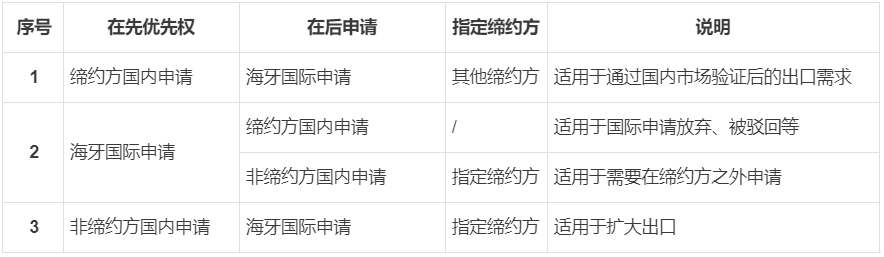 例如,中國國家知識產權局要求,優先權聲明須在國際申請提交的同時作出。優先權要求不涉及國際申請中所包括的全部外觀設計的,應指明優先權要求所涉及或所不涉及的外觀設計。要求優先權的,優先權副本無需包含在提交給國際局的申請中,但是締約方局可以要求提交優先權副本,提交副本的方式可以通過DAS碼(Digital Access Service)【1】、DM1表附件V、直接向主管局提交。