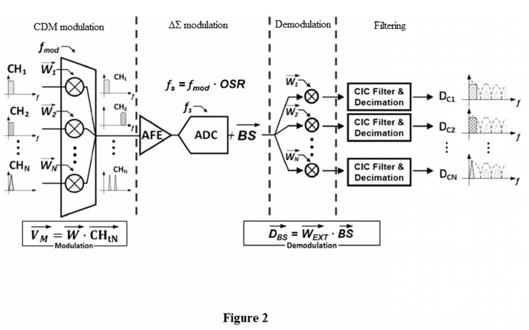 modulating multiple target input signals with code division multiplexing (CDM) to obtain a single target analog signal;