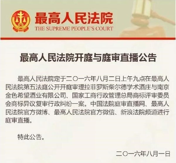 2017年4月24日,最高人民法院發布“2016年中國法院知識產權司法保護十大案件”,由集佳訴訟團隊代理的“拉菲羅斯柴爾德酒莊與國家工商行政管理總局商標評審委員會、南京金色希望酒業有限公司商標爭議行政糾紛再審案”榮登榜單。