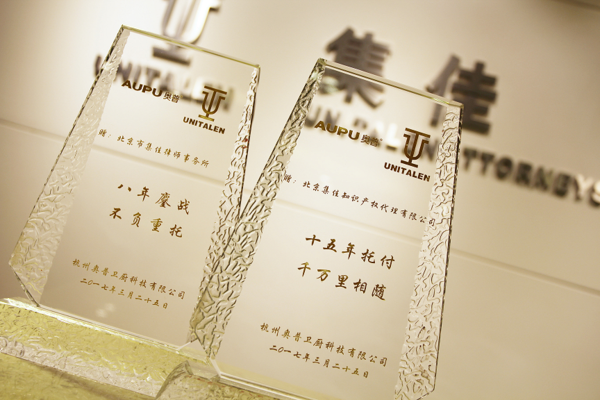 March 30, 2017, Hangzhou Aupu Electronic Co. Ltd. (Hangzhou Aupu) Chairman, Jie Fang, and Legal Director, Qiang Cui, visited Unitalen and honored the firm with a gift plague to express their gratitude for the victories acquired in all the Aupu trademark cases.