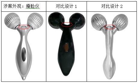 合議組認為,用于組合的對比設計特征應當是對比設計中具有相對獨立視覺效果的組成部分,是以一般消費者眼光可直接從對比設計中自然區分出來的部分。本案中,證據2的兩個按摩球中間的凸出部位實際上是手柄的頂部,證據2的手柄為一體構成,該凸出部分屬于特意劃分、截取所得出的部分,不是一般消費者可直接從證據2中自然區分獲知的,不能作為設計特征加以組合。