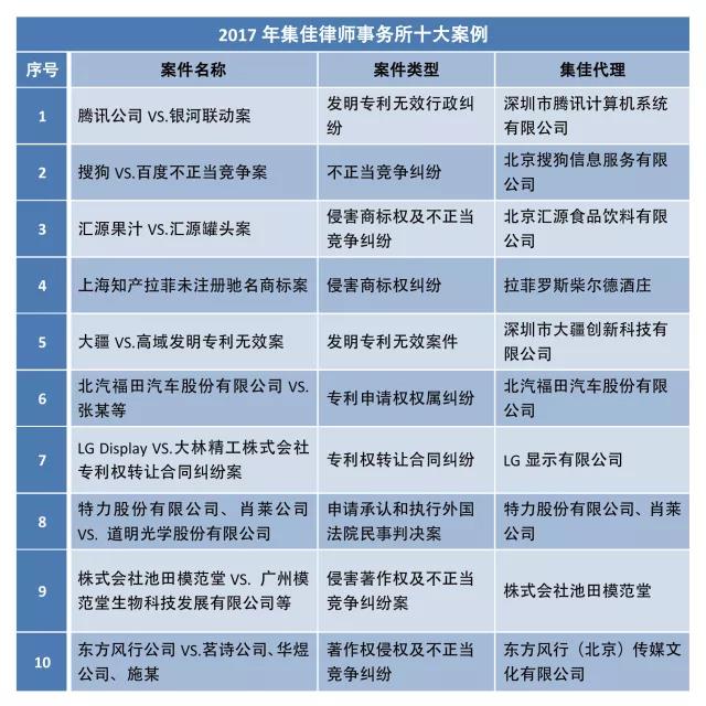 集佳代理的入選各地法院十大知識產權案例的其他典型案件如下: