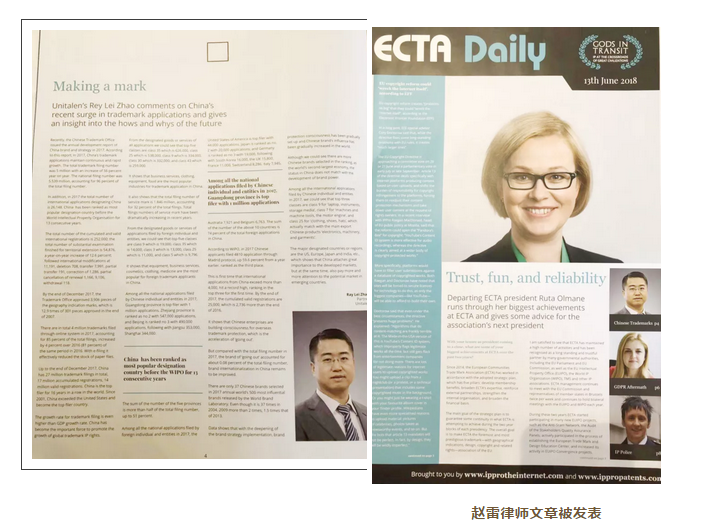 本次年會上,趙雷律師與世界各國知識產(chǎn)權(quán)界同仁探討當(dāng)前熱點(diǎn)話題和商標(biāo)發(fā)展趨勢,尋求廣泛的合作,同時也與參會代表分享了集佳近年來在國內(nèi)商標(biāo)領(lǐng)域及境外商標(biāo)實(shí)踐中取得的成績和獲得的經(jīng)驗(yàn),并與很多國家的代表建立了廣泛友好的業(yè)務(wù)聯(lián)系。此外,作為ECTA互聯(lián)網(wǎng)委員會委員,趙雷律師應(yīng)邀參加了互聯(lián)網(wǎng)委員會會議,與世界各國專家同仁就世界范圍內(nèi)互聯(lián)網(wǎng)領(lǐng)域的知識產(chǎn)權(quán)問題進(jìn)行了深入探討。會議期間,趙雷律師撰寫的文章《Making a mark》在會刊《ECTA Daily》發(fā)表,受到客戶和業(yè)界同仁的好評。