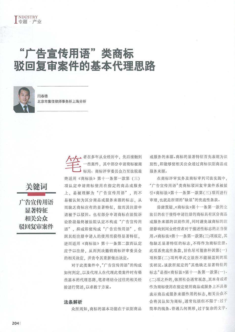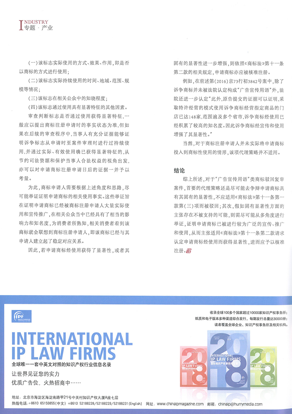 集佳文章《“廣告宣傳用語”類商標駁回復審案件的基本代理思路》在《中國知識產權》發表