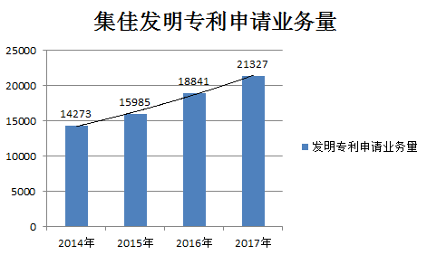 自《北京市專利代理年報》發布以來,集佳每年都在不同業務領域和不同指標排名中保持優勢,尤其在發明專利申請量、有效專利申請量、專利申請業務總量等公認值得參考的評價項目上。在此基礎上,隨著創新引領發展的趨勢日益明顯,集佳也在不斷尋求新的突破,從2014年的14273件到2017年的21327件,集佳代理發明專利申請量也在逐年增加。