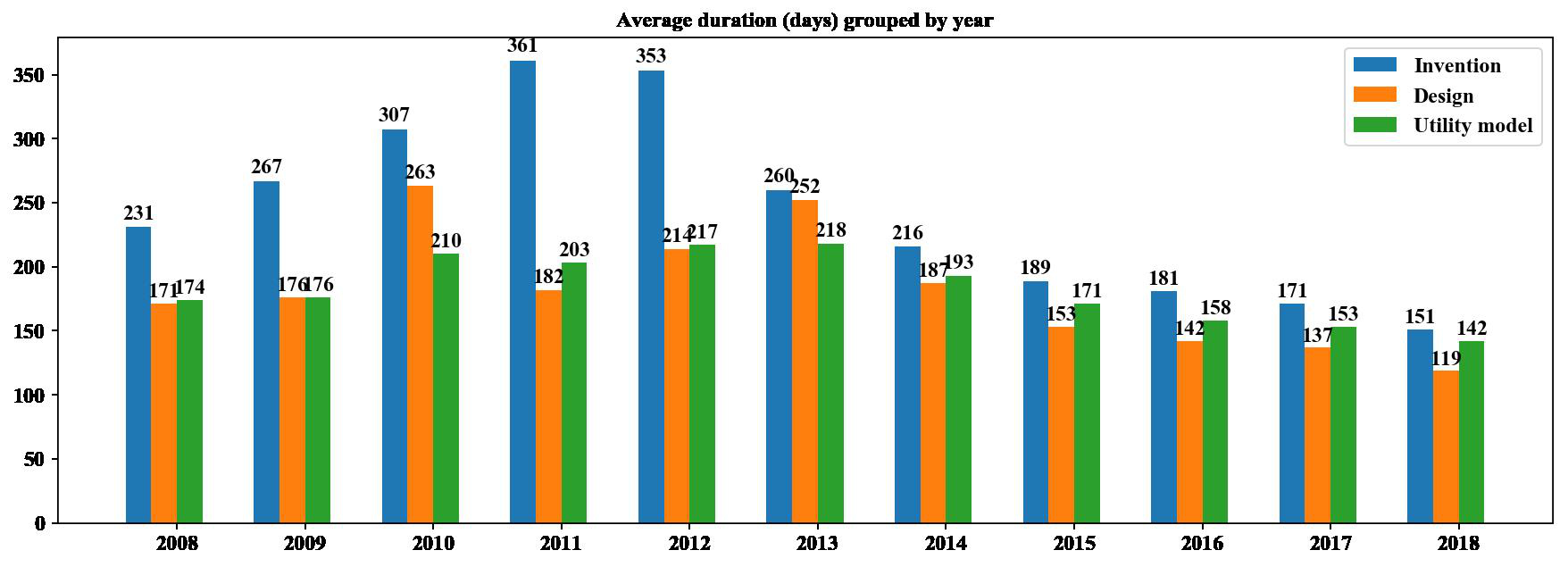 The above figure shows the average duration (days) of patent invalidation cases from the year of 2008 to 2018. As can be seen from the above figure,