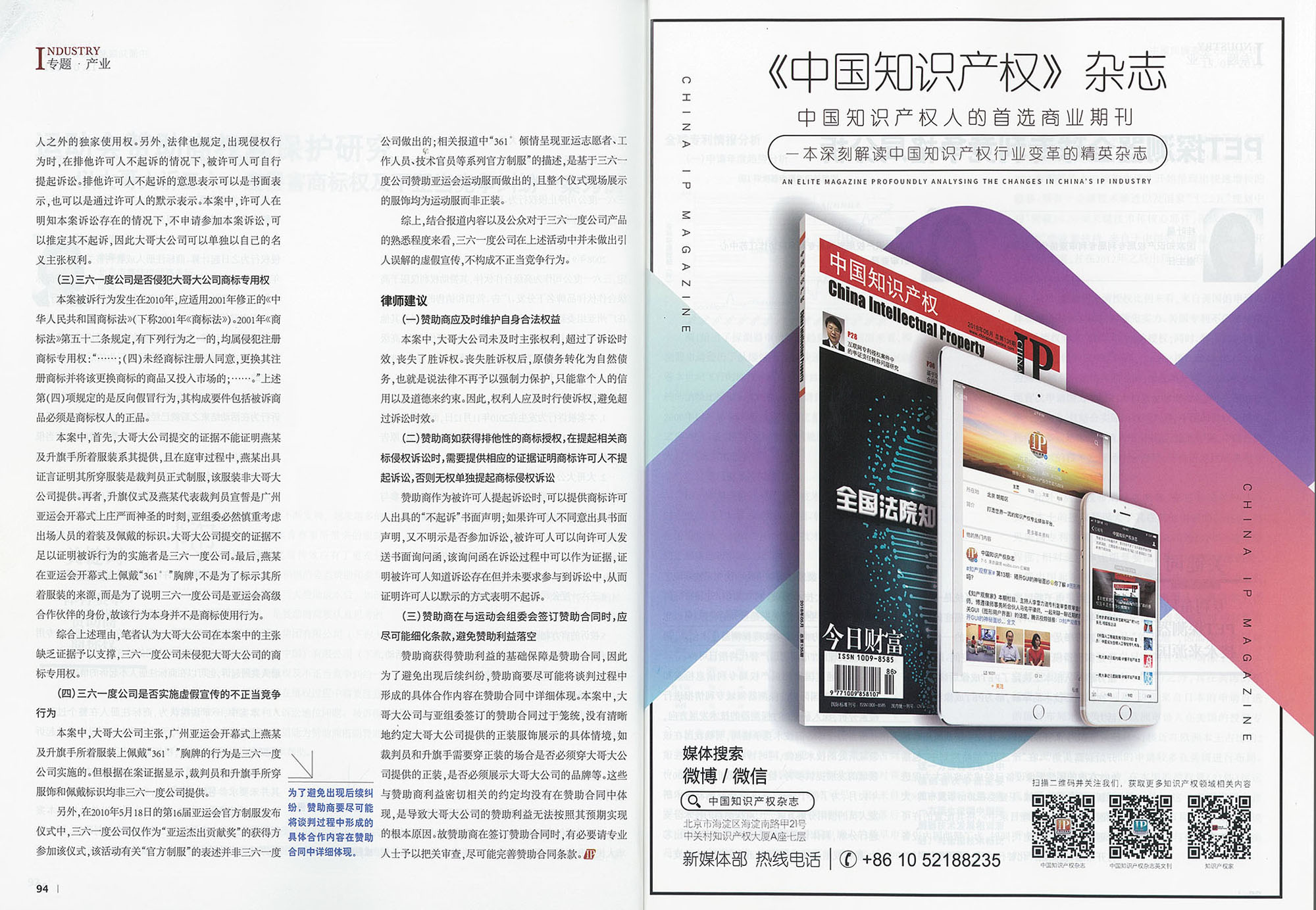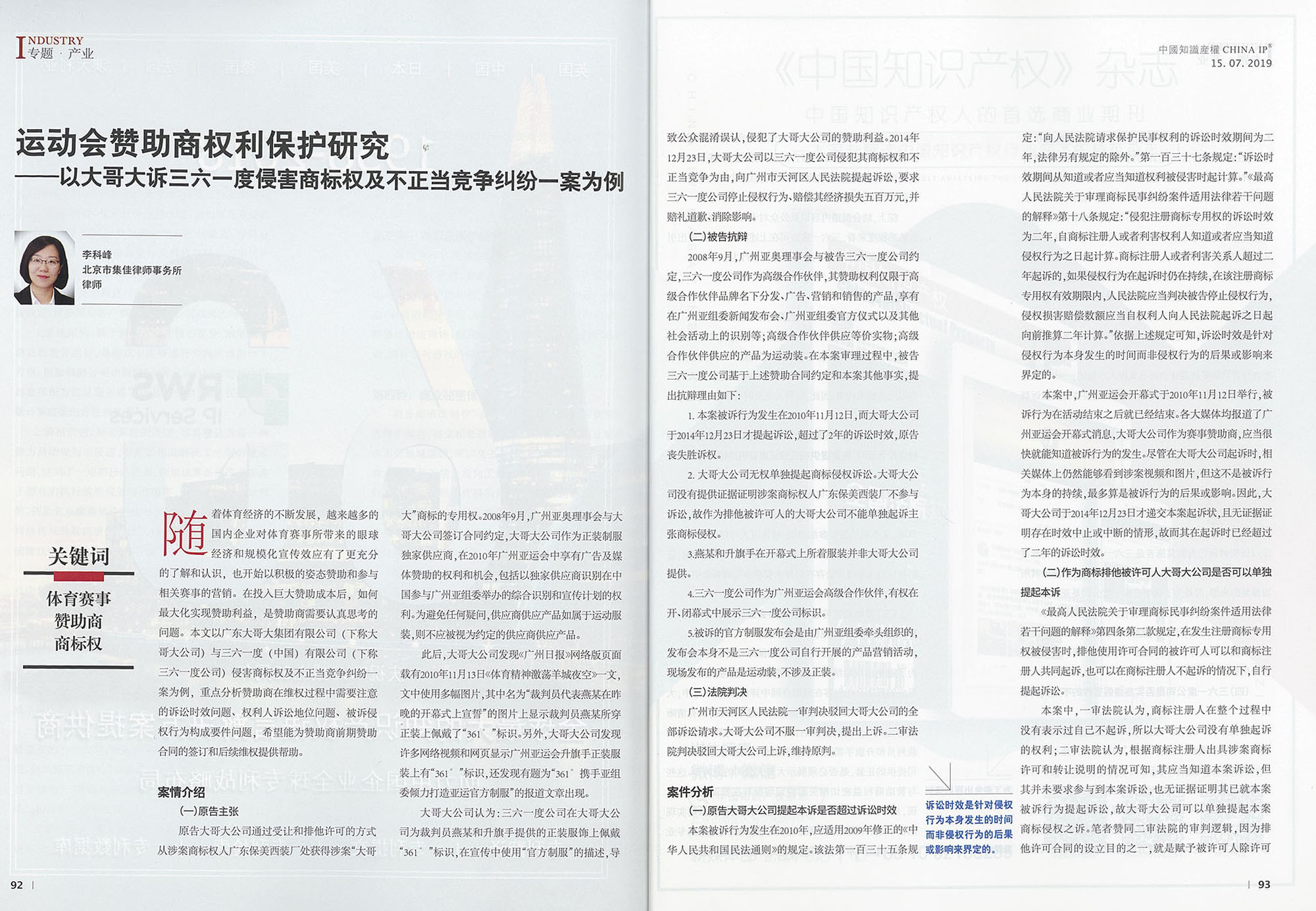 集佳文章《運(yùn)動(dòng)會(huì)贊助商權(quán)利保護(hù)研究——以大哥大訴三六一度侵害商標(biāo)權(quán)及不正當(dāng)競(jìng)爭(zhēng)糾紛一案為例》在《中國知識(shí)產(chǎn)權(quán)》 發(fā)表
