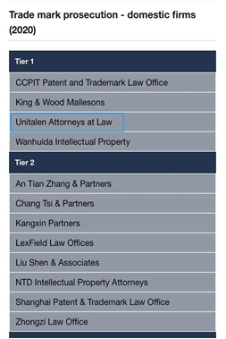 Recently, MIP, a global leading IP media, announced the 2020 IP Star ranking of trademark matters. Unitalen was found in tier 1 in Trademark Prosecution and tier 2 in Trademark Contentious again.