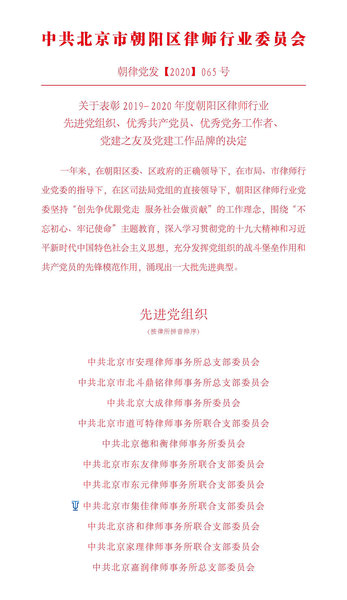 7月1日,在慶祝中國(guó)共產(chǎn)黨成立99周年之際,中共北京市朝陽區(qū)律師行業(yè)委員會(huì)下發(fā)文件表彰2019-2020年度朝陽區(qū)律師行業(yè)先進(jìn)黨組織及個(gè)人,集佳律所黨支部被授予“先進(jìn)黨組織”光榮稱號(hào)。