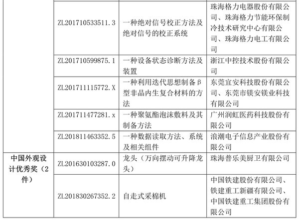 6月25日,國家知識產(chǎn)權(quán)局發(fā)布了第二十二屆中國專利獎授獎決定,為30項(xiàng)發(fā)明、實(shí)用新型專利授予中國專利金獎,10項(xiàng)外觀設(shè)計(jì)專利授予中國外觀設(shè)計(jì)金獎,60項(xiàng)發(fā)明、實(shí)用新型專利中國專利銀獎,15項(xiàng)外觀設(shè)計(jì)專利中國外觀設(shè)計(jì)銀獎,825項(xiàng)發(fā)明、實(shí)用新型專利中國專利優(yōu)秀獎,56項(xiàng)外觀設(shè)計(jì)專利中國外觀設(shè)計(jì)優(yōu)秀獎。