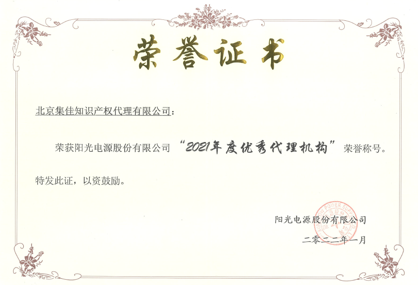 新春伊始,集佳服務再次喜獲客戶點贊——陽光電源股份有限公司授予集佳“2021年度優秀代理機構”榮譽稱號,并授予集佳專利代理師安淼、胡素莉“2021年度金牌代理師”稱號,陳穎“2021年度新星代理師”稱號。