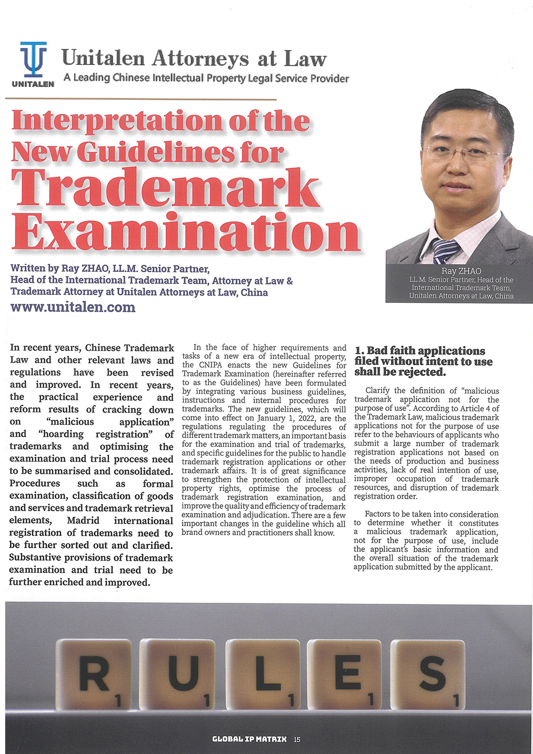 集佳文章《Interpretation of the New Guidelines for Trademark Examination》在《The global IP Matrix》發表