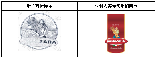 由以上對比可以看出,權(quán)利人實(shí)際使用的商標(biāo),圖形背景部分與注冊商標(biāo)形狀略有不同,文字部分也多了英文“pasta”,但“pasta”中文含義為“意大利面食”,實(shí)際上為訴爭商標(biāo)核定使用商品的通用名稱,因此自身缺乏顯著性,權(quán)利人實(shí)際使用的商標(biāo)顯著性識別要素仍為“ZARA及圖形”。