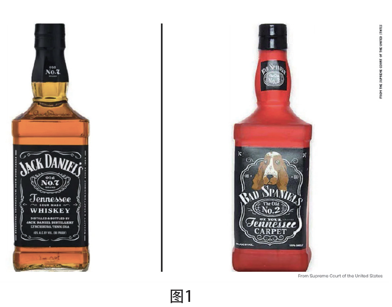威士忌品牌Jack Daniel's(下稱“杰克丹尼”)訴寵物玩具公司VIP Products LLC(下稱“寵物玩具公司”)商標(biāo)侵權(quán)一案,由美國(guó)最高法院于2023年6月8日宣判,標(biāo)志著這場(chǎng)始于2014年的案件有了最終結(jié)果。涉案商品是一款寵物狗咀嚼玩具,其外形與杰克丹尼酒瓶近似(見圖1),主體部分文字為“Bad Spaniels”,字體采用相同的反顯,將杰克丹尼的“Old No.7 Brand Tennessee Sour Mash Whiskey”,改成了“The Old No.2 On Your Tennessee Carpet”。杰克丹尼這款經(jīng)典酒含有40%的酒精含量,而涉案玩具商品承諾含有“43%的大便,保證100%臭烘烘”。寵物玩具公司是美國(guó)第二大寵物玩具生產(chǎn)商,其還生產(chǎn)其他寵物狗咀嚼系列玩具“Silly Squeakers”,模仿戲謔其他酒類品牌,如Dos Perros(戲仿Dos Equis)、Smella Arpaw(戲仿Stella Artois)以及Doggie Walker(戲仿Johnnie Walker)。