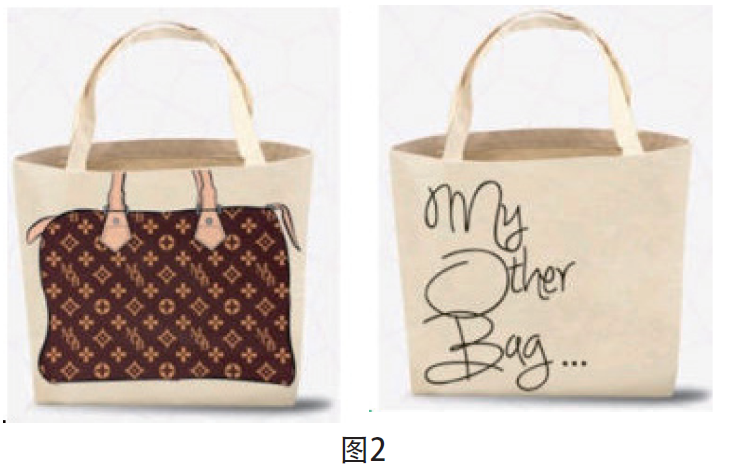 2014年,路易威登(Louis Vuitton)對(duì)一家女士托特包生產(chǎn)商“My Other Bag”(我的另一個(gè)包)發(fā)起了訴訟。My Other Bag主要銷售價(jià)格親民的帆布托特包,在其廣告宣傳中,左側(cè)出現(xiàn)大牌托特包的圖片,右側(cè)寫著“我的另一個(gè)包”,包形與路易威登的托特包一致(見圖2)。My Other Bag的創(chuàng)始人Tara Martin女士辯稱,設(shè)計(jì)這種包的目的是為具有環(huán)保理念的消費(fèi)者提供具有設(shè)計(jì)感的可重復(fù)使用托特包,而不必背著昂貴的大牌包裝生活用品。Martin女士解釋道,研發(fā)此款托特包的初衷是“玩笑式地戲仿”大牌托特包,主打?qū)嵱眯裕越o消費(fèi)者帶來多元的品位和選擇。