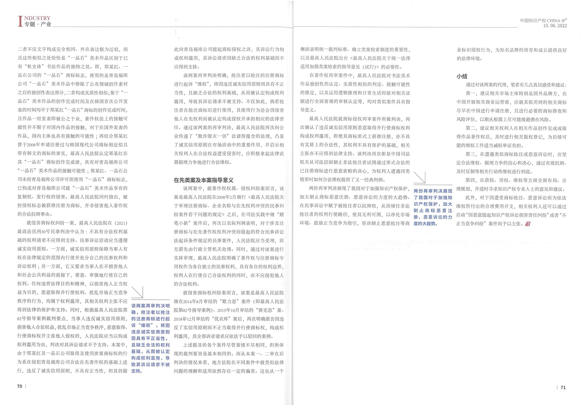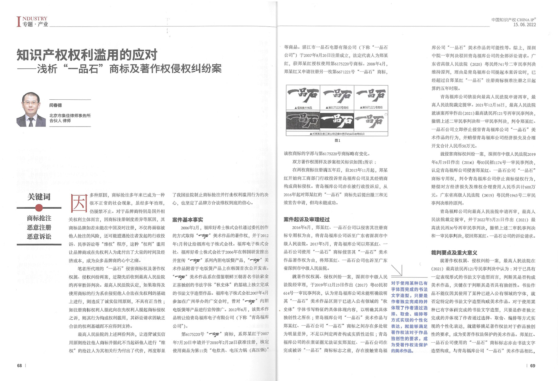 集佳文章《知識產(chǎn)權(quán)權(quán)利濫用的應(yīng)對——淺析“一品石”商標(biāo)及著作權(quán)侵權(quán)糾紛案》在《中國知識產(chǎn)權(quán)》發(fā)表