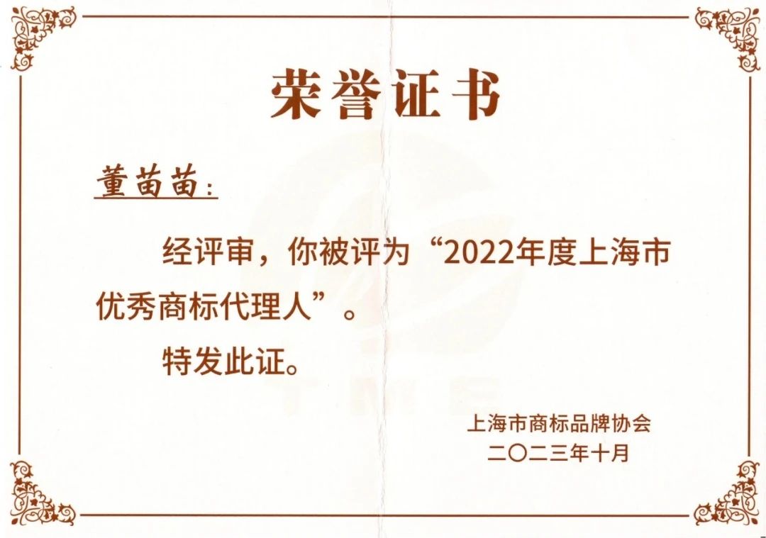 集佳上海分所董苗苗律師被評(píng)為2022年度“上海市優(yōu)秀商標(biāo)代理人”。