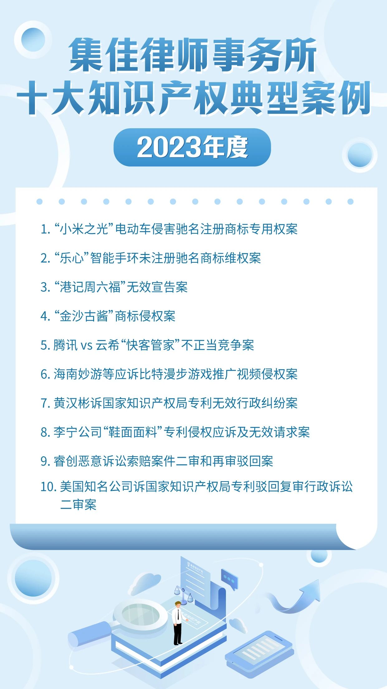 作為迎接4.26世界知識產權日的獻禮之一,北京市集佳律師事務所已連續十年開展十大知識產權典型案例的評選活動,其意義不僅在于展現集佳律師團隊的專業能力和水準,更在于傳遞集佳全方位服務客戶的理念。在第24個世界知識產權日來臨之際,集佳律所從2023年度代理的眾多知識產權案件中篩選出具有代表性的十大案例,與各界同仁分享: