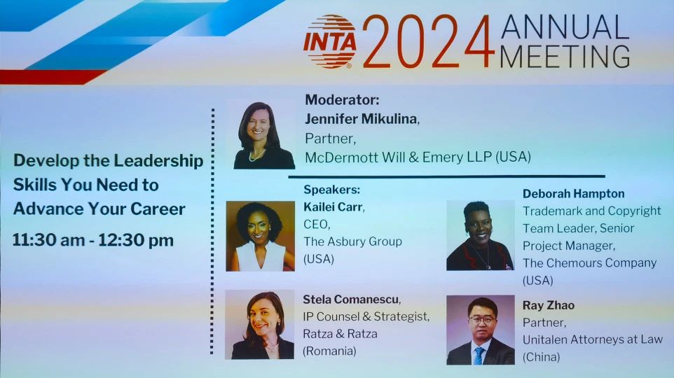 2024年5月20日下午(美國亞特蘭大當地時間),國際商標協會(INTA)146屆年會領導力專家論壇在美國亞特蘭大佐治亞世界會議中心順利舉行,集佳合伙人趙雷律師受邀出席,并就develop the leadership skills you need to advance your career主題,在美國律師Jennifer Mikulina女士主持下,與其他三位來自美國和羅馬尼亞企業的專家發表精彩演講與分享。