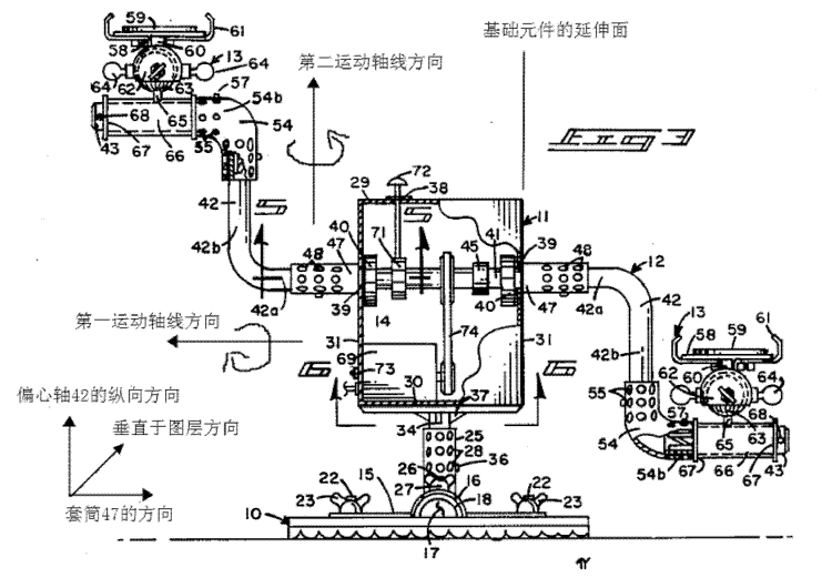對比文件4僅僅公開了曲柄的轉動平面能夠圍繞通過銷57所限定的水平軸線來調整。然而,對比文件4中的曲柄不能夠被等同為案例中的“運動元件(17,18)”因為曲柄并非安裝在底板94上而是安裝在殼體90上。