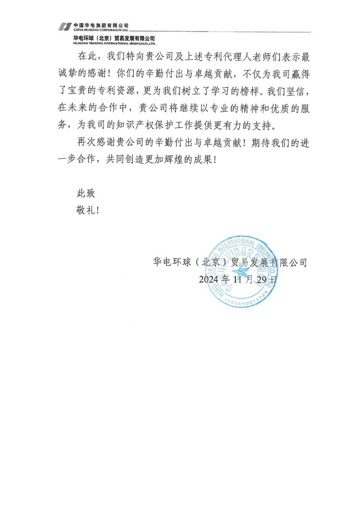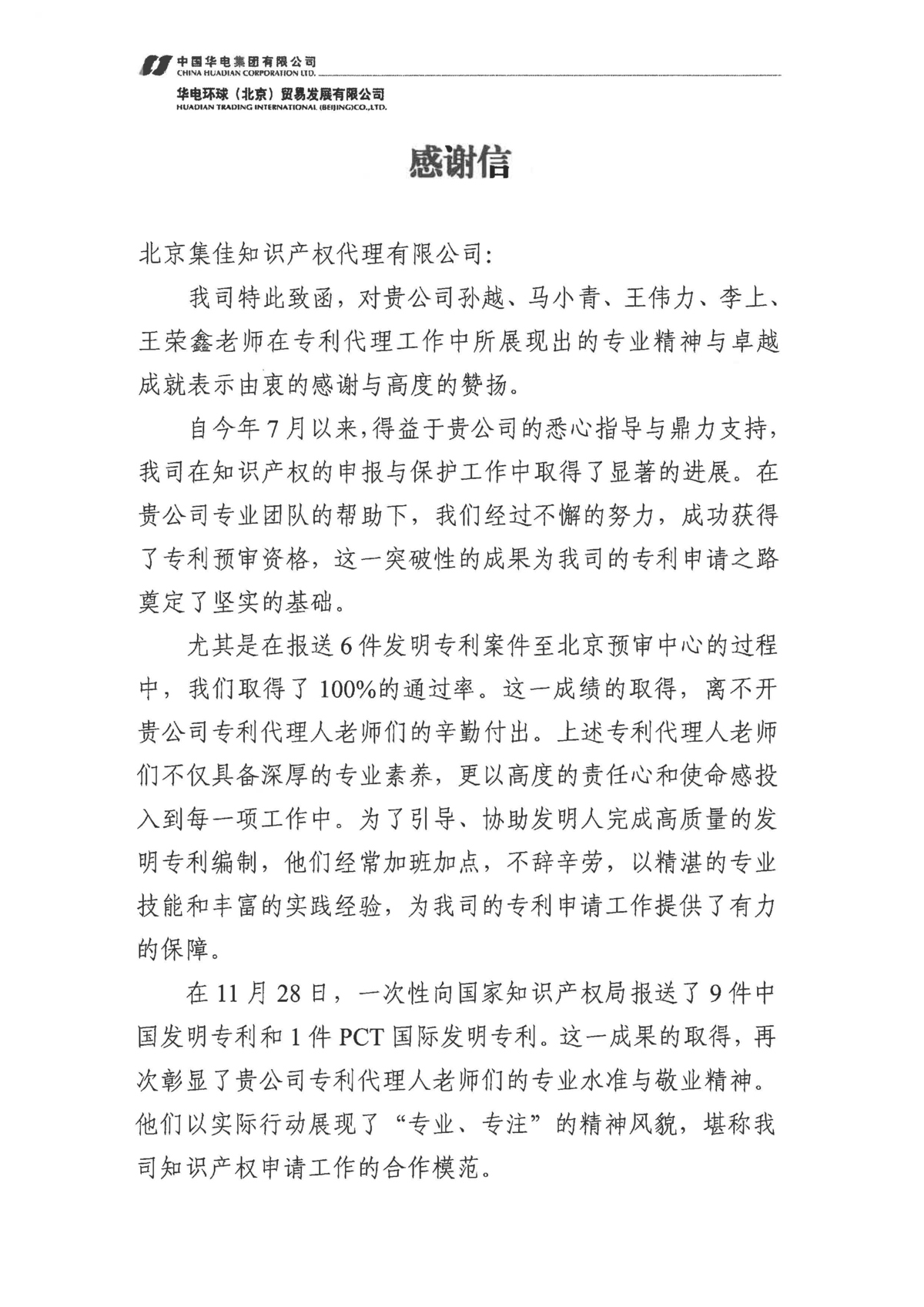 近日,集佳收到客戶華電環球(北京)貿易發展有限公司的感謝信,對集佳在知識產權申報與保護工作中給予的專業指導與大力支持表示由衷感謝,同時對集佳孫越、馬小青、王偉力、李上、王榮鑫等專業人員在專利代理工作中所展現出的專業精神與卓越成就表示高度贊揚!