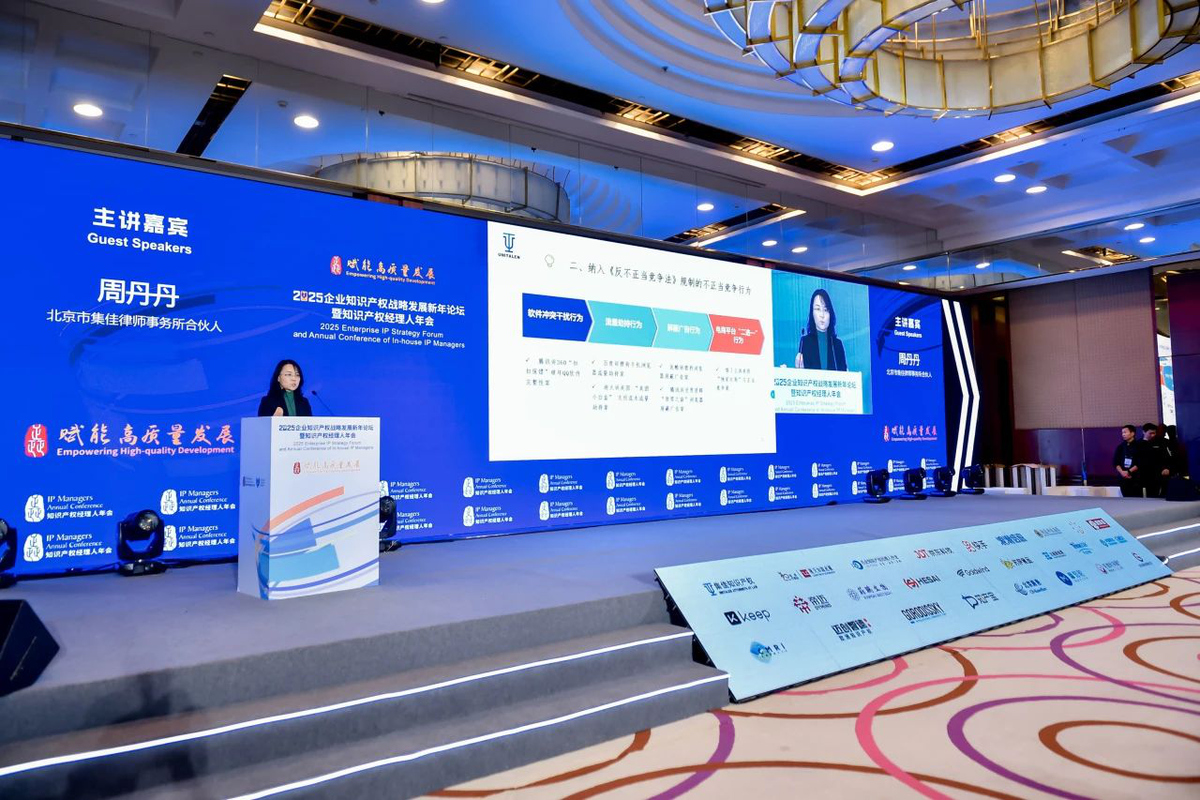本次年會以“賦能高質量發展”為主題,深入探討大數據、人工智能等前沿技術在企業知識產權領域的創新應用。受主辦方邀約,集佳合伙人周丹丹律師為此次大會帶來主題演講,她圍繞 “《反不正當競爭法》修改對企業知識產權工作的影響”這一主題,詳細說明了此次《反不正當競爭法》(草案)的主要修訂核心內容,分享了對《反不正當競爭法》修改趨向的思考,并結合近十年不正當競爭領域的典型案例和多年代理競爭類案件的實戰經驗對企業提出一系列企業競爭行為的合規建議,引發現場嘉賓與知識產權從業者的關注與探討。