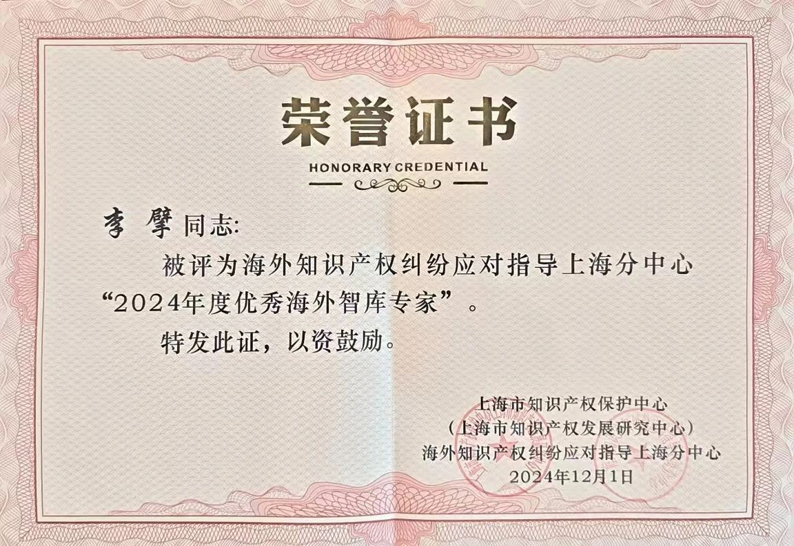 集佳上海分所合伙人李擘律師憑借在海外知識產(chǎn)權(quán)爭議糾紛解決領(lǐng)域的卓越能力及客戶的認(rèn)可,被評為海外知識產(chǎn)權(quán)糾紛應(yīng)對指導(dǎo)上海分中心“2024年度優(yōu)秀海外智庫專家”。