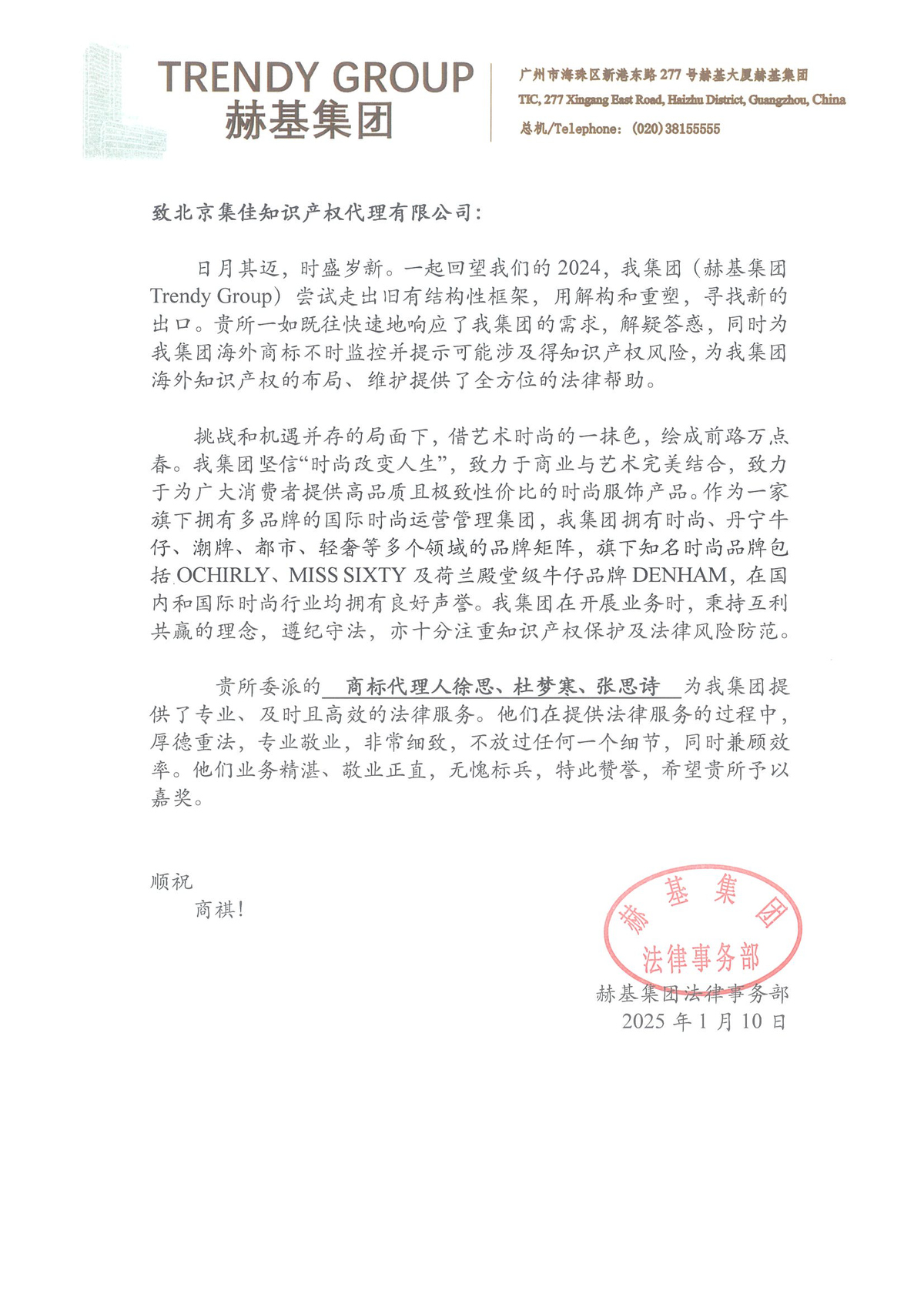 信中指出,集佳在2024年一如既往、迅速地為赫基集團提供了專業(yè)的知識產(chǎn)權(quán)保護建議,多起由集佳代理的案件取得了對赫基集團有利的結(jié)果,為赫基集團的生產(chǎn)、經(jīng)營、管理和其他活動方面都提供了全方位的法律幫助。