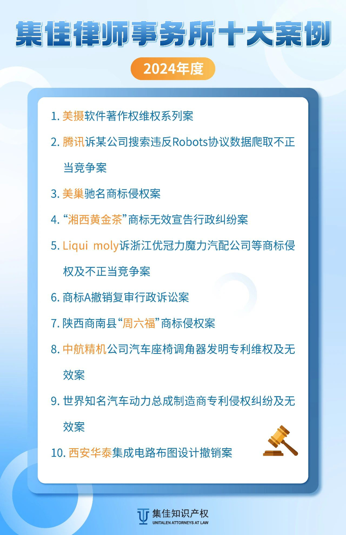 在世界知識(shí)產(chǎn)權(quán)日來臨之際,集佳律所從代理的眾多知識(shí)產(chǎn)權(quán)案件中篩選出2024年度具有代表性的十大案例,與各界同仁分享。這些案例具有較強(qiáng)的法律適用的典型意義和較大的社會(huì)影響,充分體現(xiàn)了國家知識(shí)產(chǎn)權(quán)保護(hù)的良好水平,體現(xiàn)了訴訟代理團(tuán)隊(duì)的專業(yè)水準(zhǔn),同時(shí)也為與之類似案件提供了可資借鑒的維權(quán)范本。以下為2024年度北京市集佳律師事務(wù)所十大案例名錄: