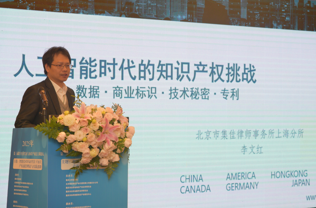 集佳上海分所主任李文紅博士則以“人工智能時代的知識產權挑戰”為題,結合多個典型案例,系統剖析了版權、數據、商業標識、專利四大領域面臨的全新課題。他指出,AI訓練數據的合法使用邊界、生成內容的著作權歸屬、數據權益的司法保護等問題已成為行業焦點,其分享的高德訴萬得不正當競爭案、抖音訴億??颇P蛥登謾喟傅葘崉瞻咐瑸楝F場嘉賓提供了極具價值的實踐參考,引發廣泛共鳴。