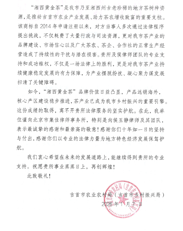 該案自2016年起,歷經異議、無效宣告、一審、二審及再審程序,歷時近十年。在這一漫長而艱難的法律維權過程中,集佳團隊、特別是主辦律師侯玉靜律師,憑借卓越的專業能力、豐富的實務經驗及對案件高度負責的專業態度,出色完成了各階段的法律事務,贏得司法機關的全面支持,最終有力維護了吉首市“湘西黃金茶”地理標志證明商標的合法權利,捍衛了吉首市茶產業發展的核心品牌資產,為產業擺脫紛擾、凝心聚力謀發展掃清了關鍵障礙。